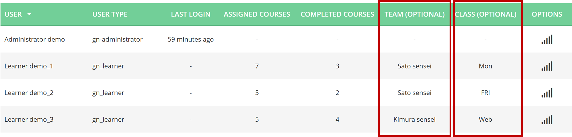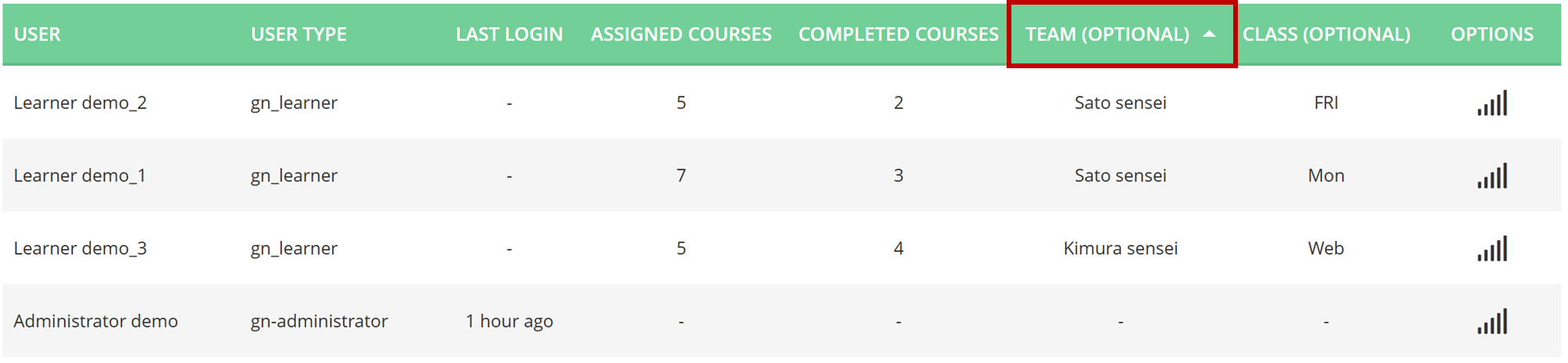 3) ユーザー/チーム/クラスの各項目が並ぶ一覧が表示されます。
