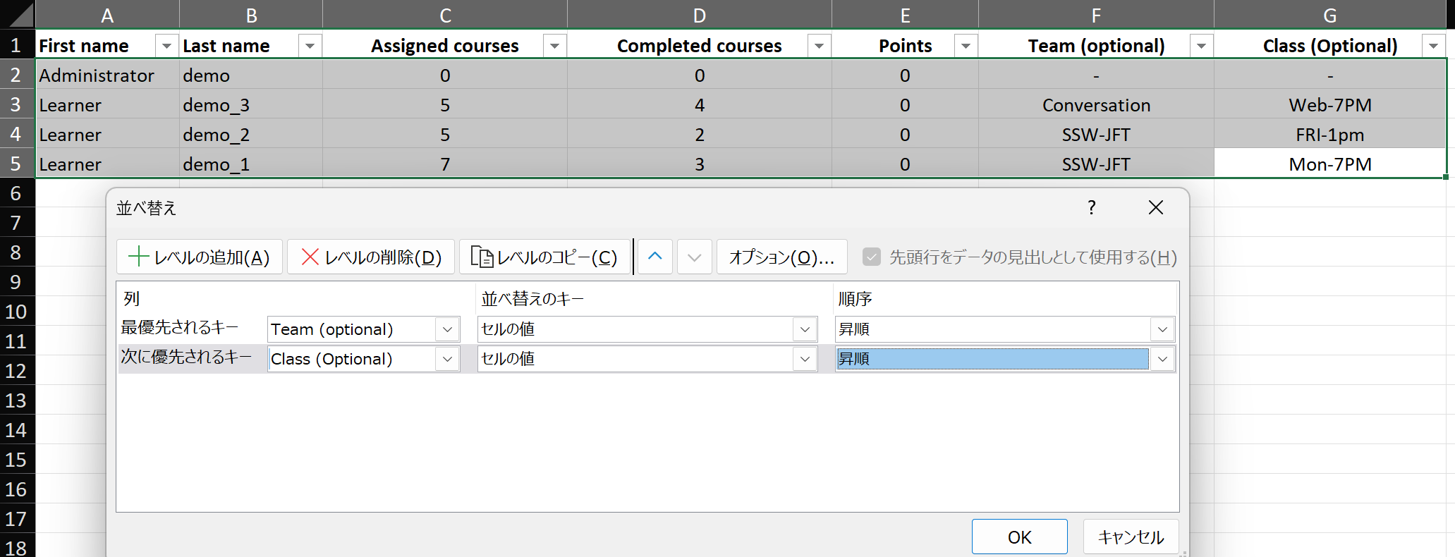6) Excelファイルには同じ生徒情報が含まれており、「チーム」「クラス」の両方でソートできます。