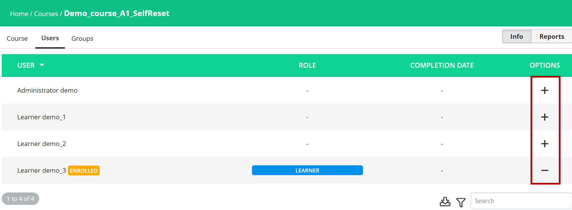 4) "+" で生徒をコースに登録、"-" で登録解除できます。