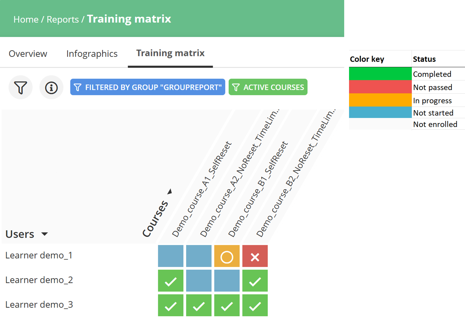 Example (see below chart): Learner Demo_1 has many “Not started,” “In progress,” and “Not passed” statuses —
