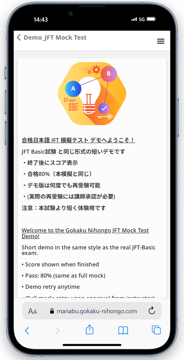 Click below to explore a sample Gokaku Nihongo JFT Mock test — just like your students would experience it.
